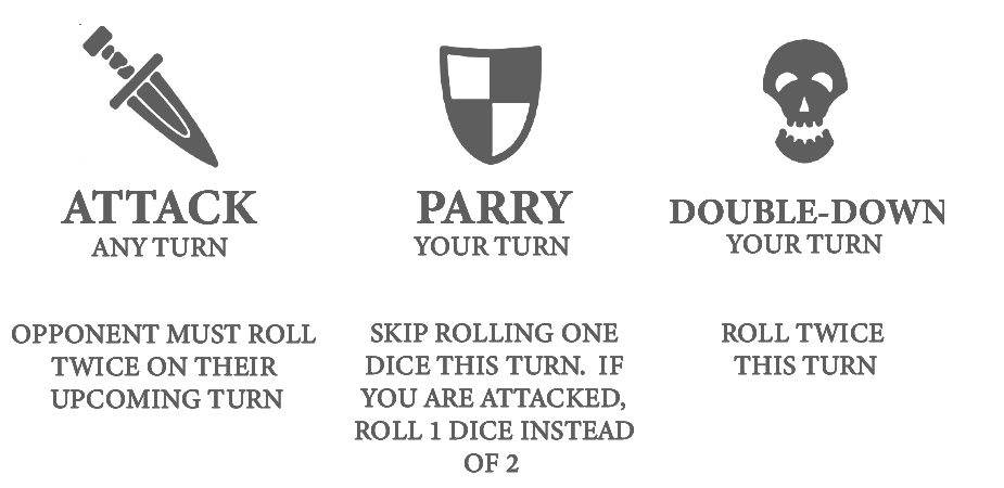 EXAMPLE: 'PLAYER 1' ROLLS 15. ON 'PLAYER 2'S' TURN, 'PLAYER 1' DECLARES THEY WANT TO ATTACK. 'PLAYER 2' DECLARES THEY WILL PARRY, AND INSTEAD OF ROLLING TWICE, THEY ONLY ROLL ONCE. THE ROUND PROCEEDS AS NORMAL IN THIS CASE.